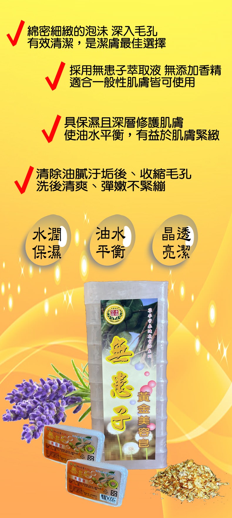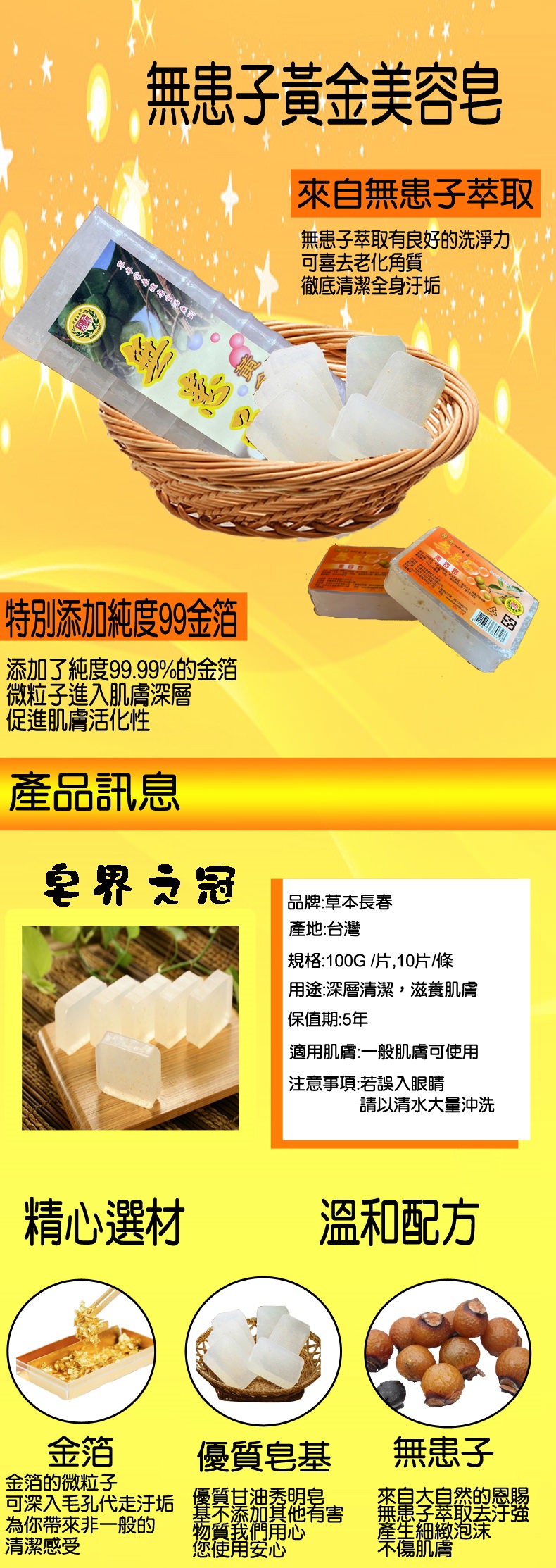 產品成分:無患子萃取液、999黃金箔、皂乳。
